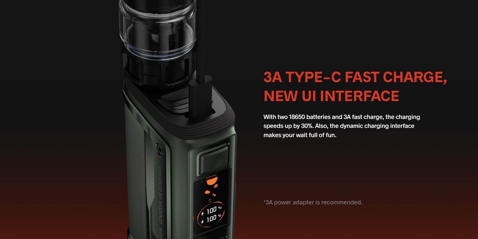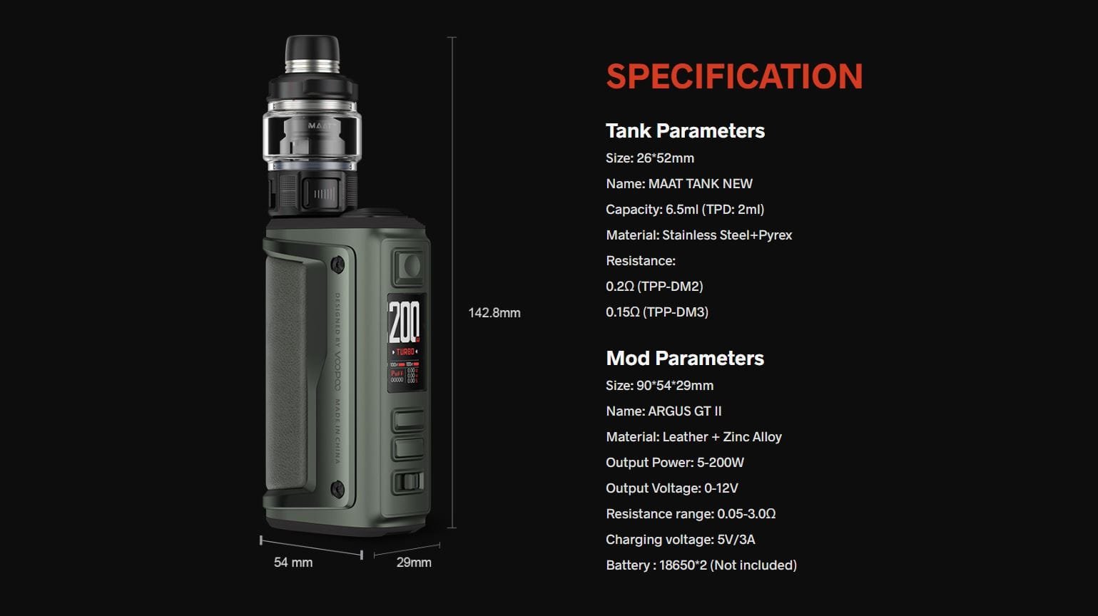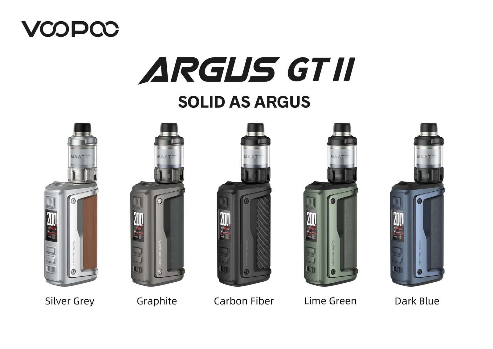 El kit Argus GT 2 de Voopoo es el dispositivo más robusto de la marca, ya que resiste a agua, polvo y golpes. Ofrece una salida estable de hasta 200W de potencia, gracias al uso de dos baterías 18650, y viene equipado con el atomizador Maat Tank de 2ml que ofrece un vapeo DL profundo al reducir la pérdida de flujo de aire en un 60%.