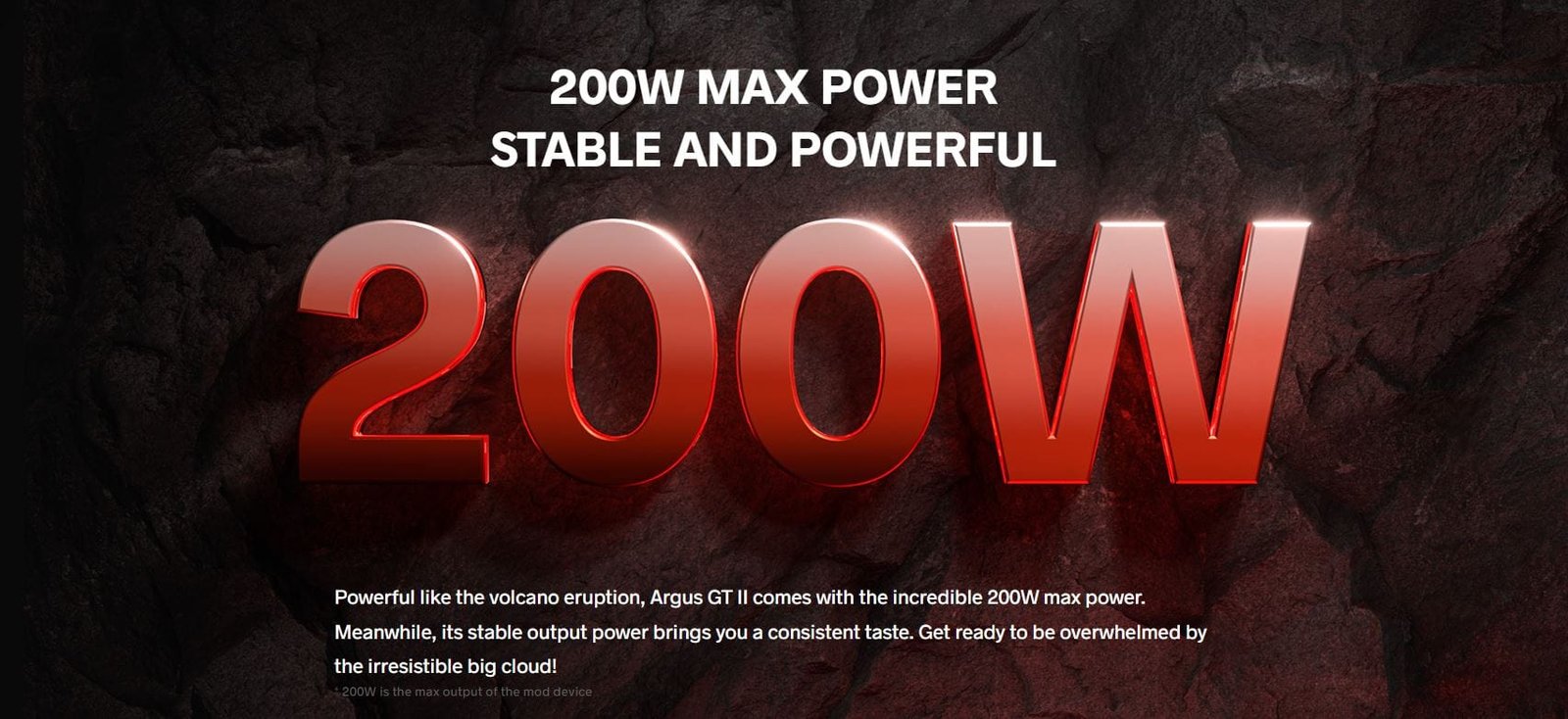 Potente como la erupción de un volcán, el Argus GT II ofrece una increíble potencia máxima de salida estable de 200W para un sabor optimizado y constante.