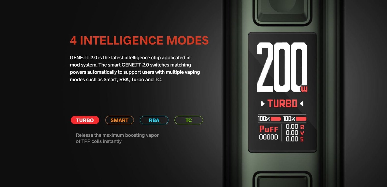 El chip GENE.TT 2.0 permite múltiples modos de vapeo como Smart, RBA, Turbo y CT.
