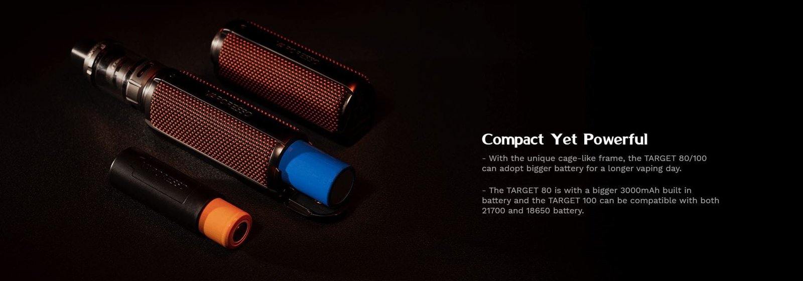 El Target 100 optimiza el espacio del mod para poder ofrecer un tamaño más pequeño y ligero, a pesar de utilizar una batería 21700 o 18650.
