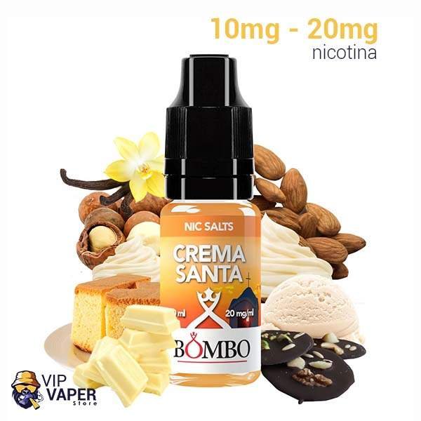 El líquido Crema Santa de la gama Postres y Cremosos de Bombo Nic Salts propone una exquisita base de bizcocho y crema pastelera con chocolate blanco y negro, vainilla y virutas de los mejores frutos secos, adornado con azúcar de coco. Todo una delicia.