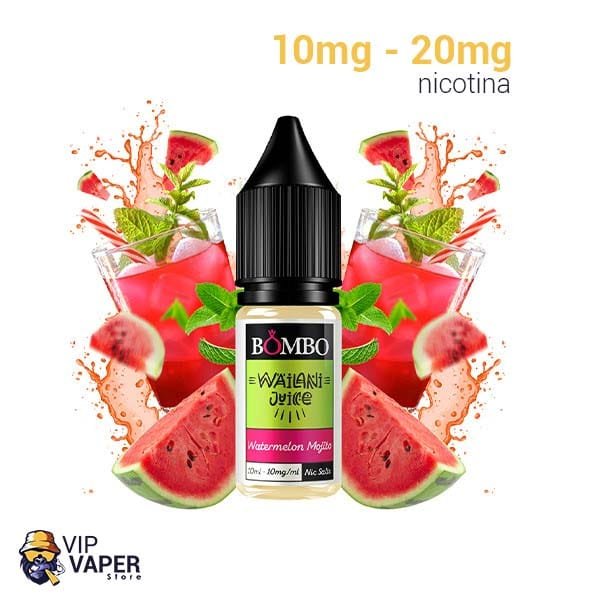 Sales Watermelon Mojito de Wailani Juice Nic Salts by Bombo sabe a un sorprendente y delicioso mojito de sandía. Una mezcla sabrosa y refrescante, llena de matices y contrastes que lo hacen único.
